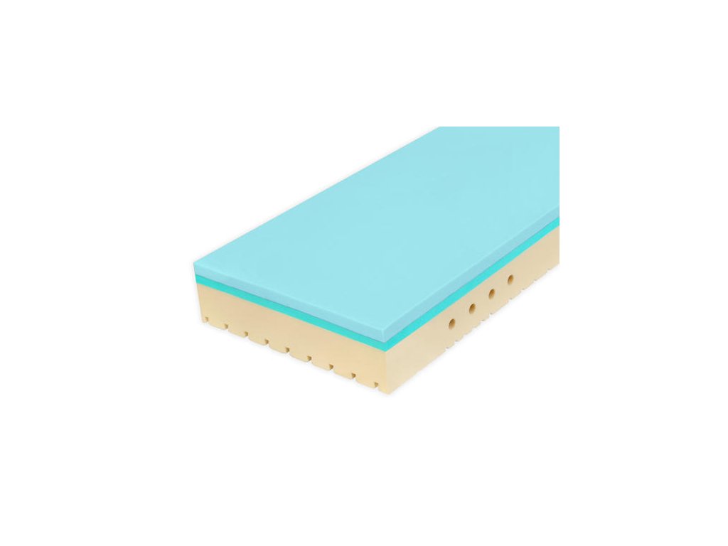 - tyrkysová vrstva - Studená pěna Flexifoam - super pružná studená pěna napomáhá správné termoregulaci a zajituje extra odrazovou pružnost. To znamená, že se při spánku budete snadno otáčet.
